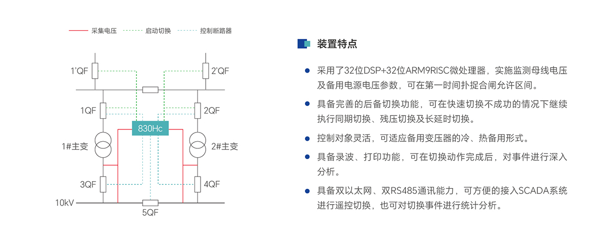 MBKQ-830Hc系列無擾動電源切換裝置適用于35kV及以下電壓等級的備用電源快速投切控制。在系統(tǒng)供電電源發(fā)故障時, MBKQ-830Hc根據(jù)系統(tǒng)運行狀態(tài),迅速切除故障電源,檢測備用電源與工作母線電壓矢量數(shù)值。在50ms內(nèi)捕捉兩側(cè)電壓相位重合點,100ms內(nèi)完成備用電源快速無擾動投入。避免在電源切換時造成的電源中斷或者設備沖擊損壞,保證負荷不斷電連續(xù)運行。